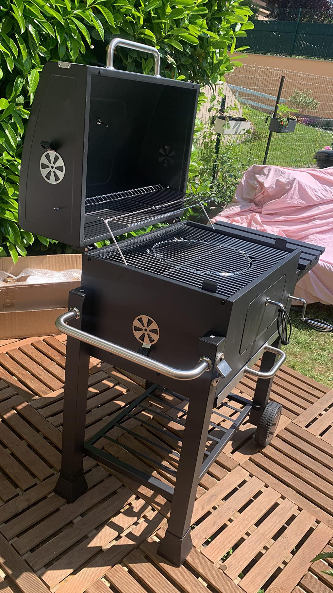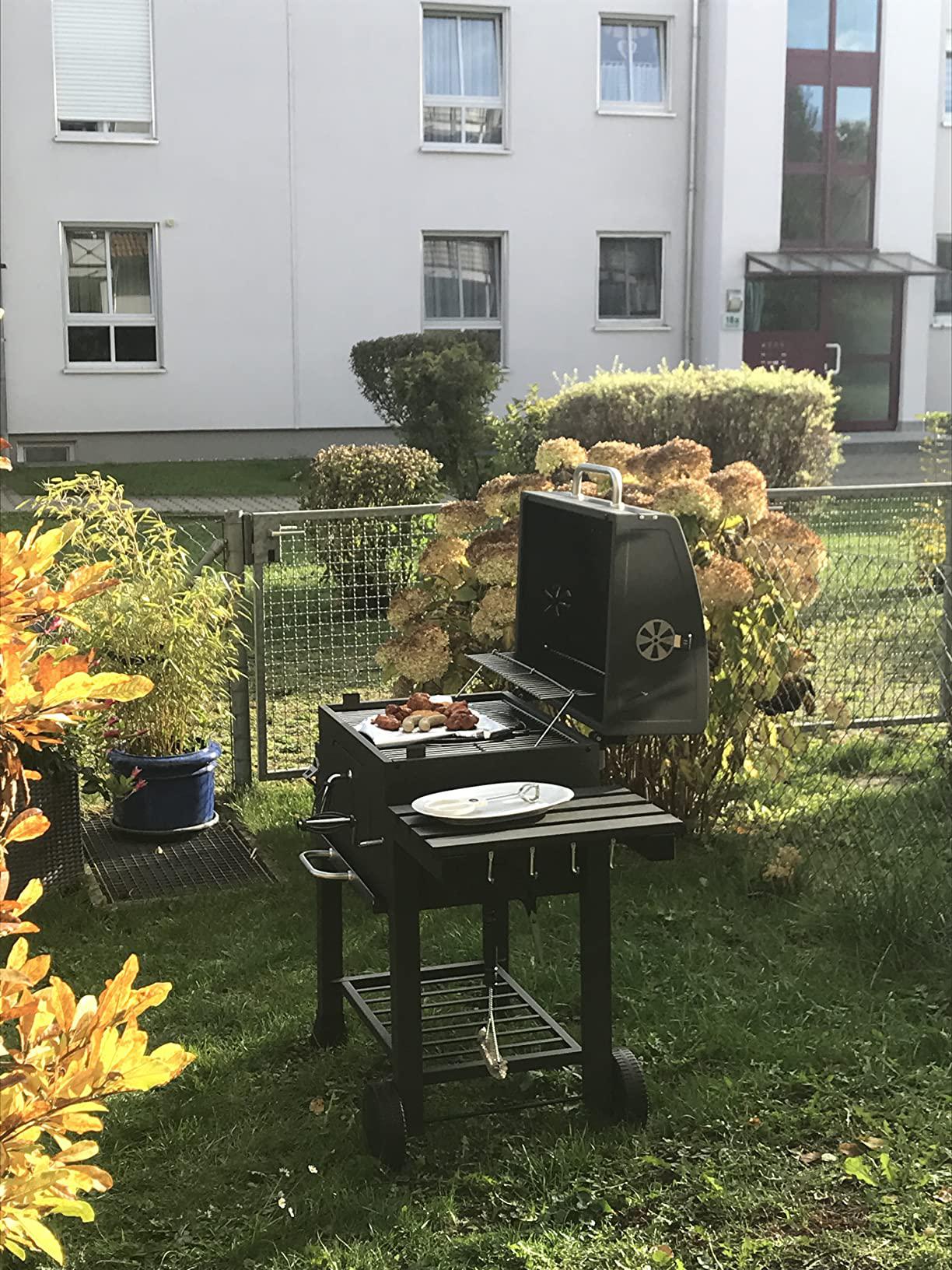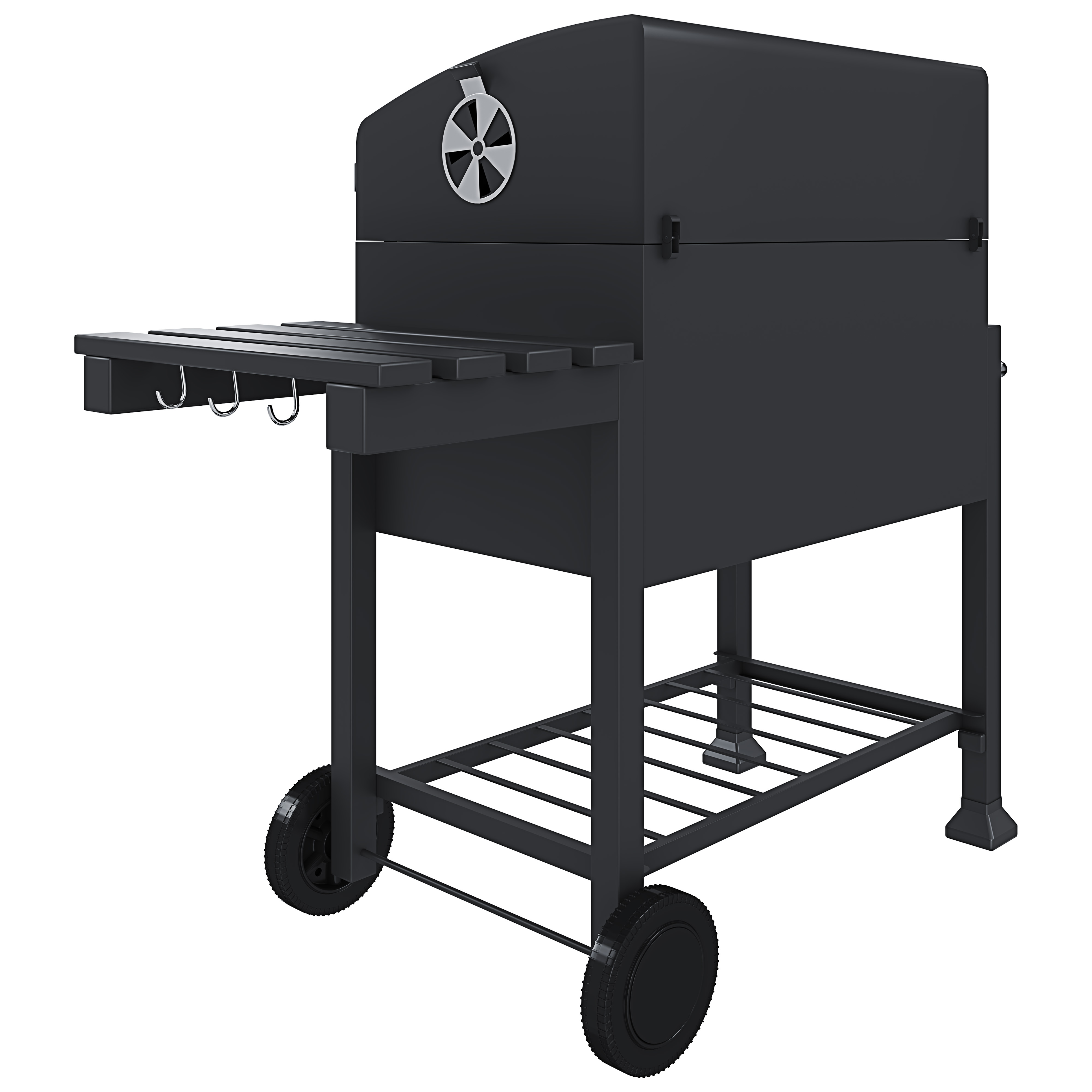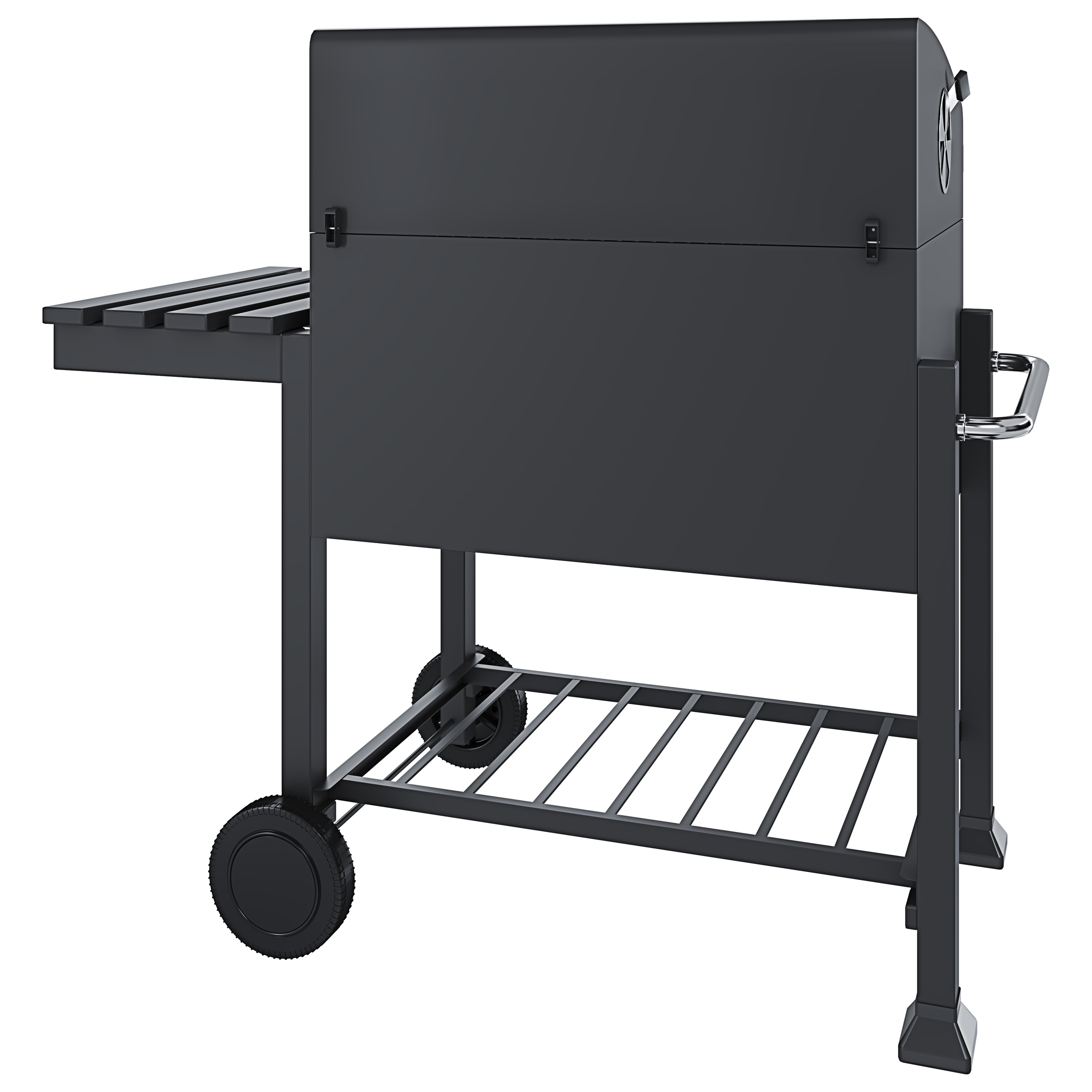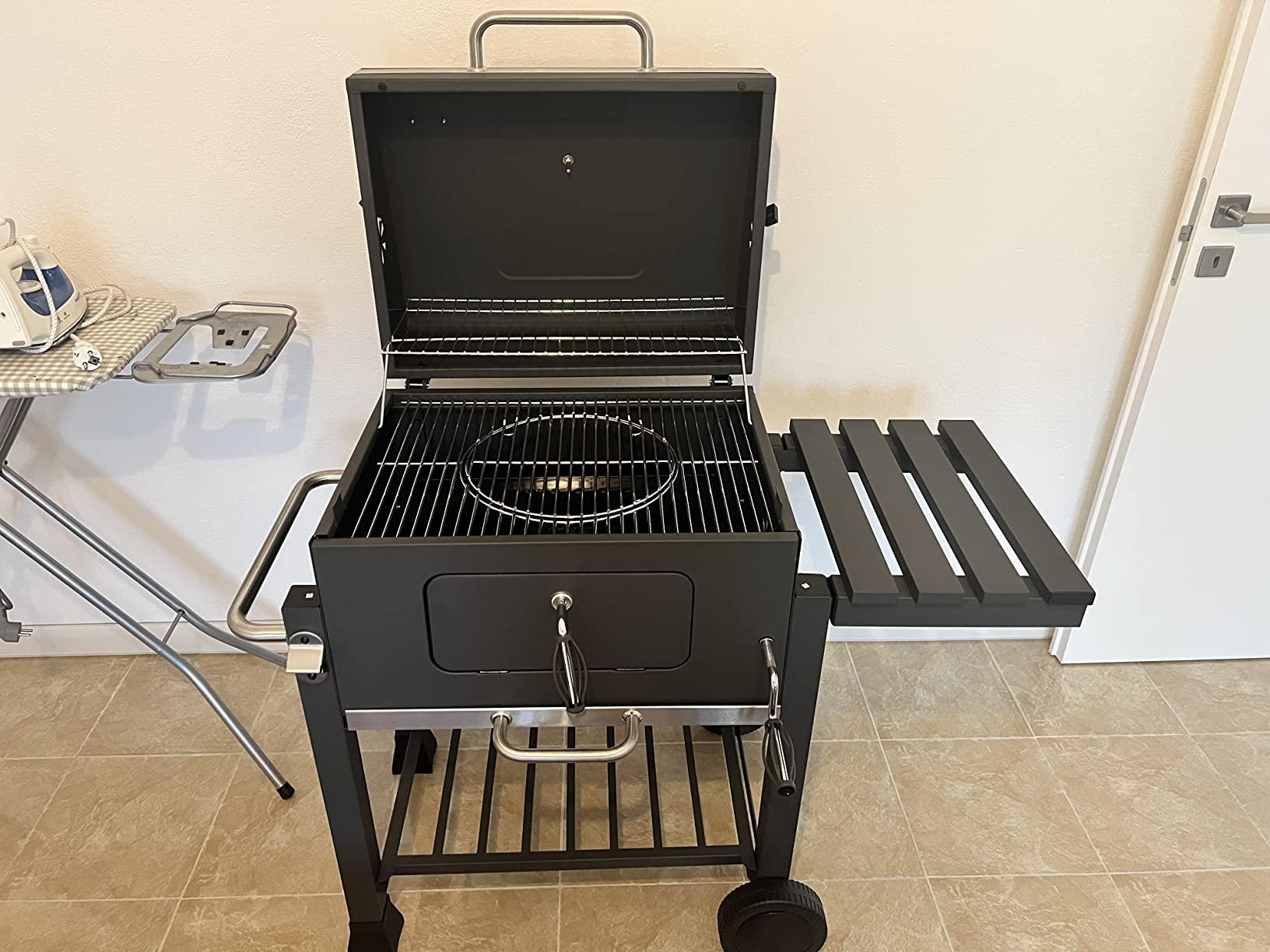 Barbecue Grill A Carbonella BBQ Da Giardino Picnic Balcone Terrazzo Con Coperchio Ruote E Termometro Ripiano Laterale Ribaltabile Con 4 Ganci Manico In Acciaio Inox 106 x 46 x 114 cm Colore Nero