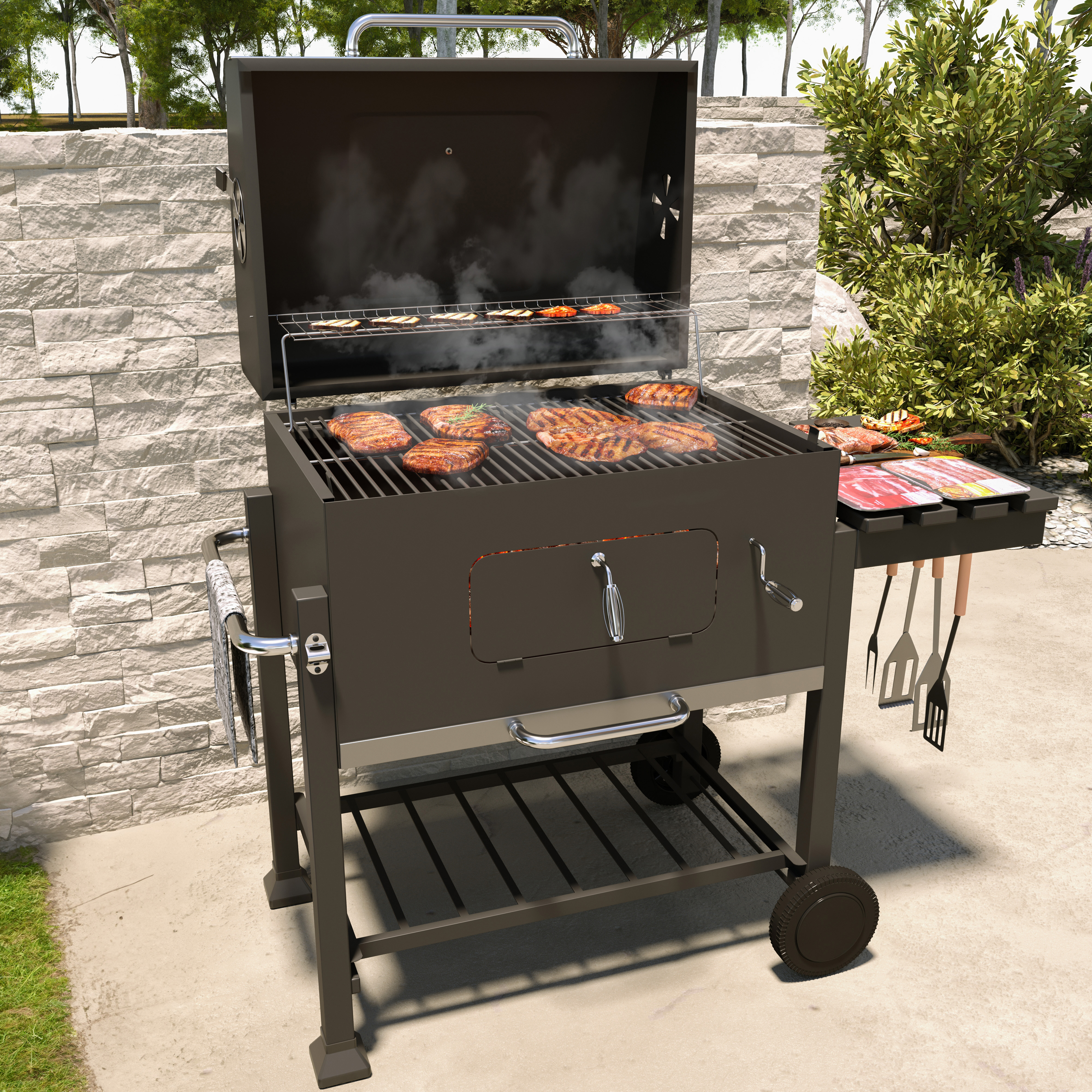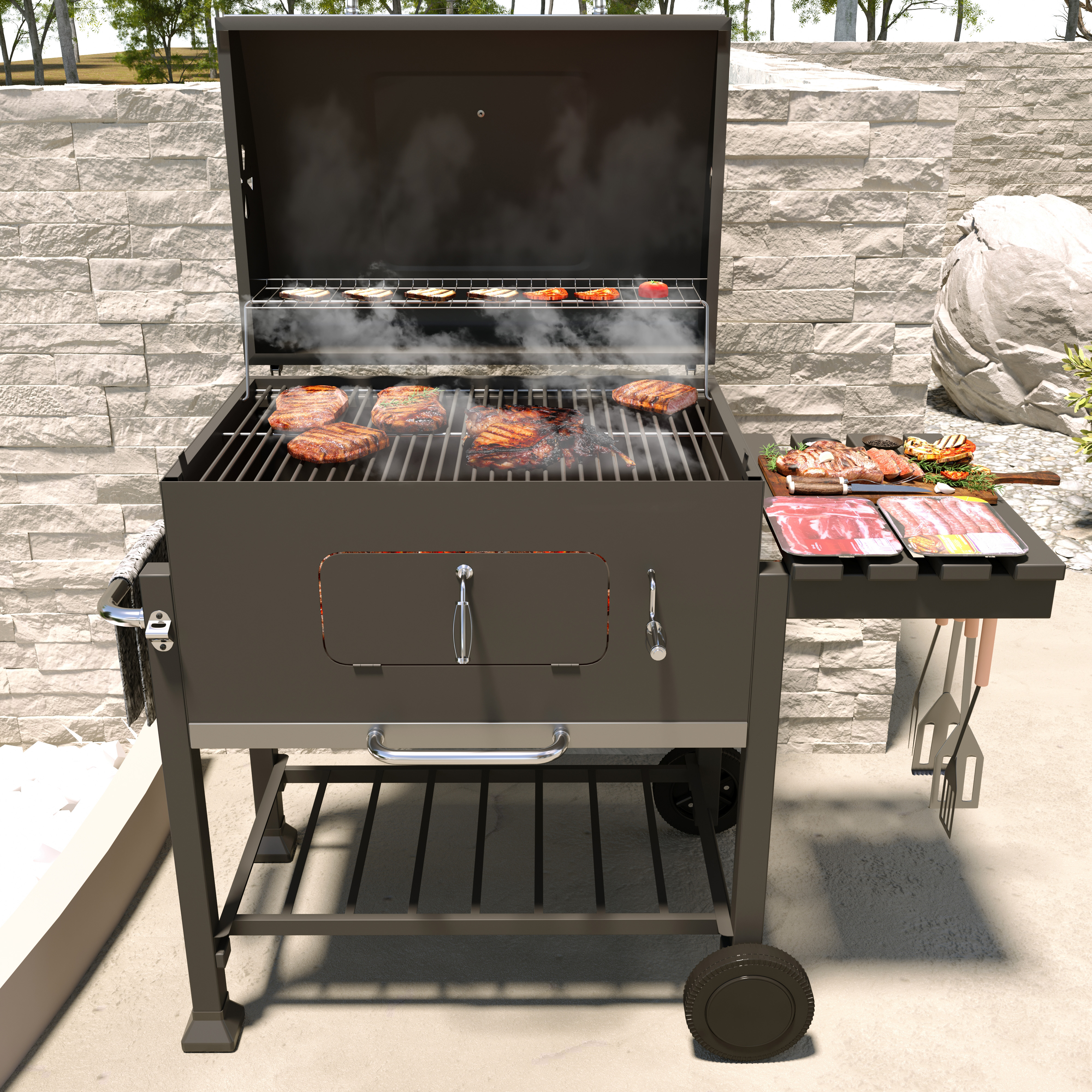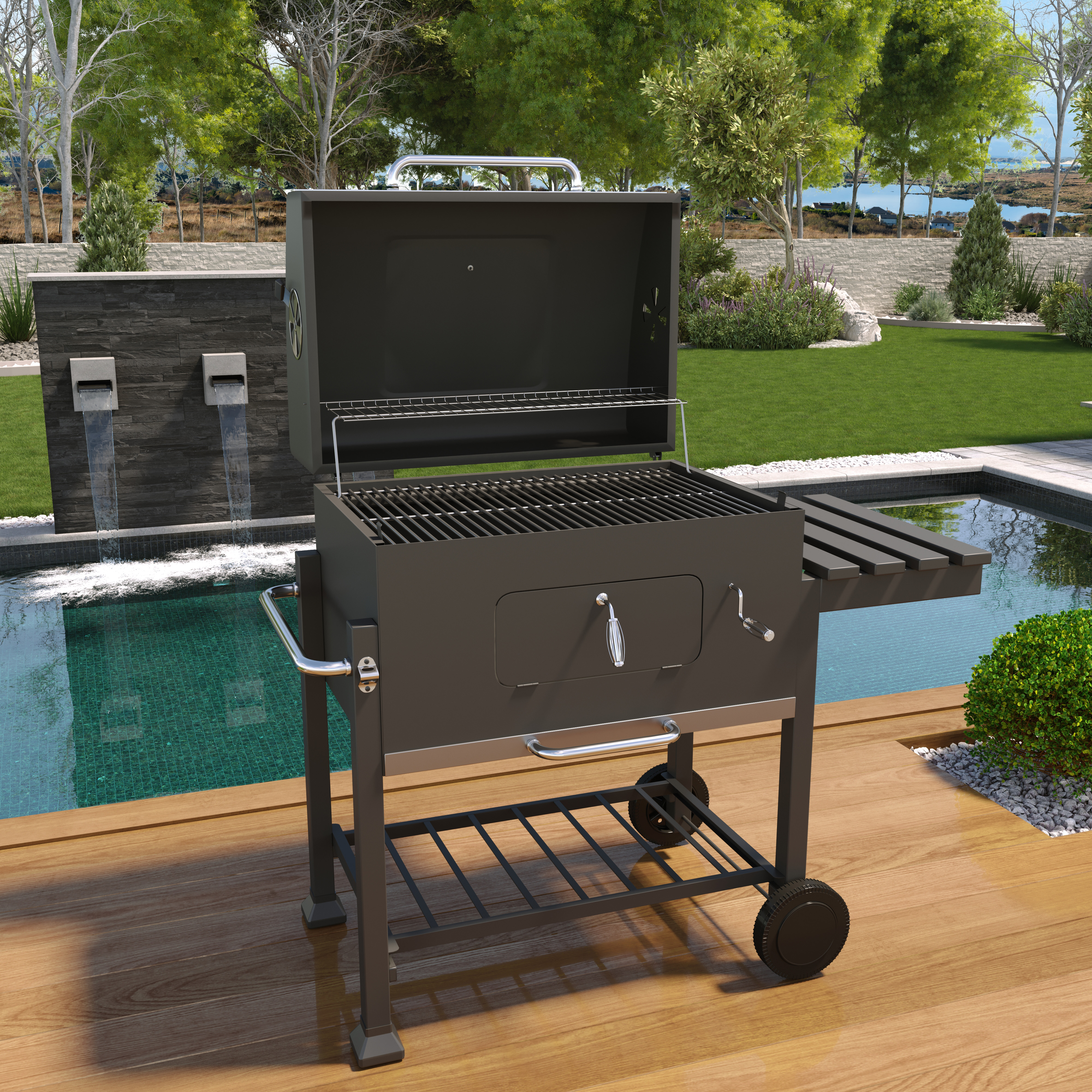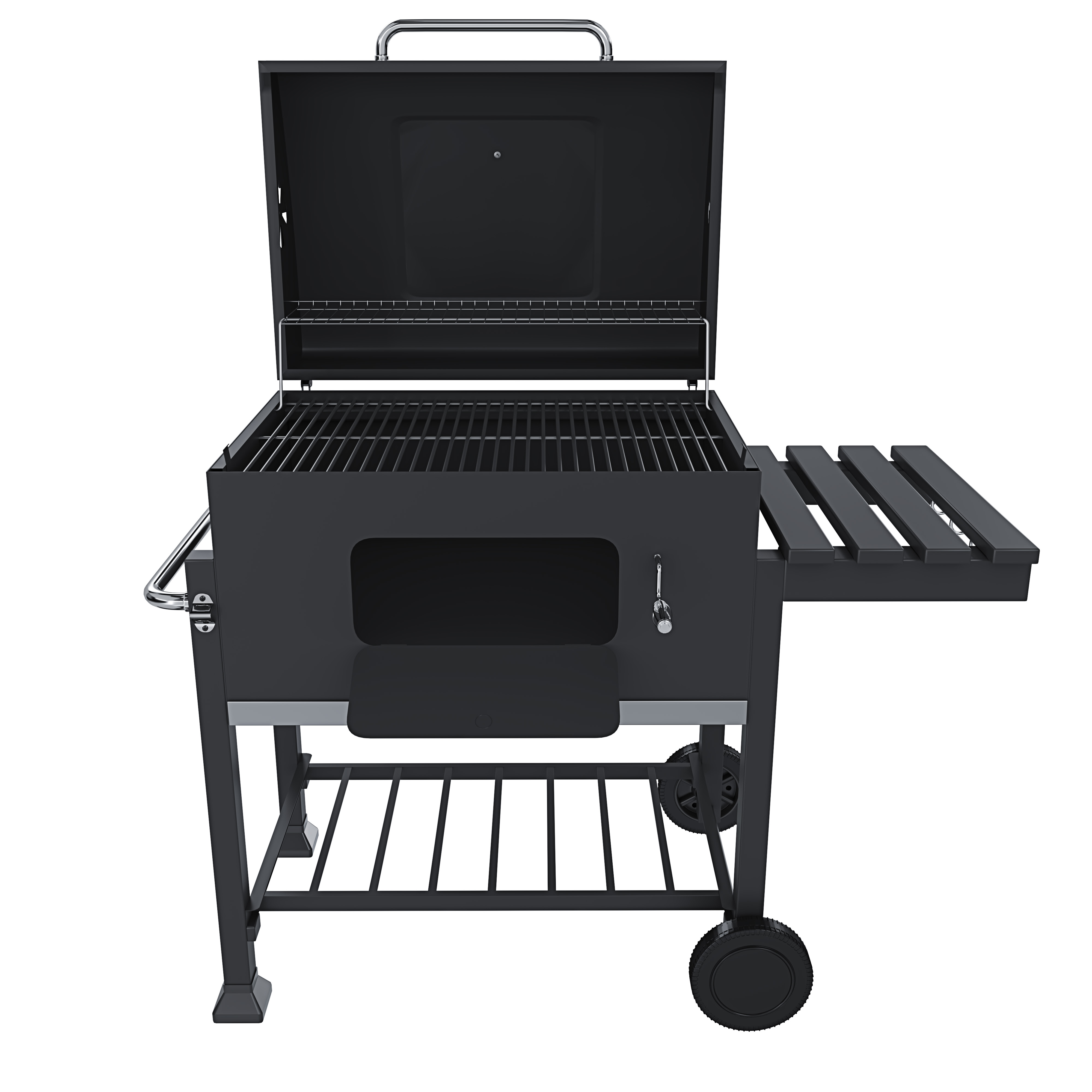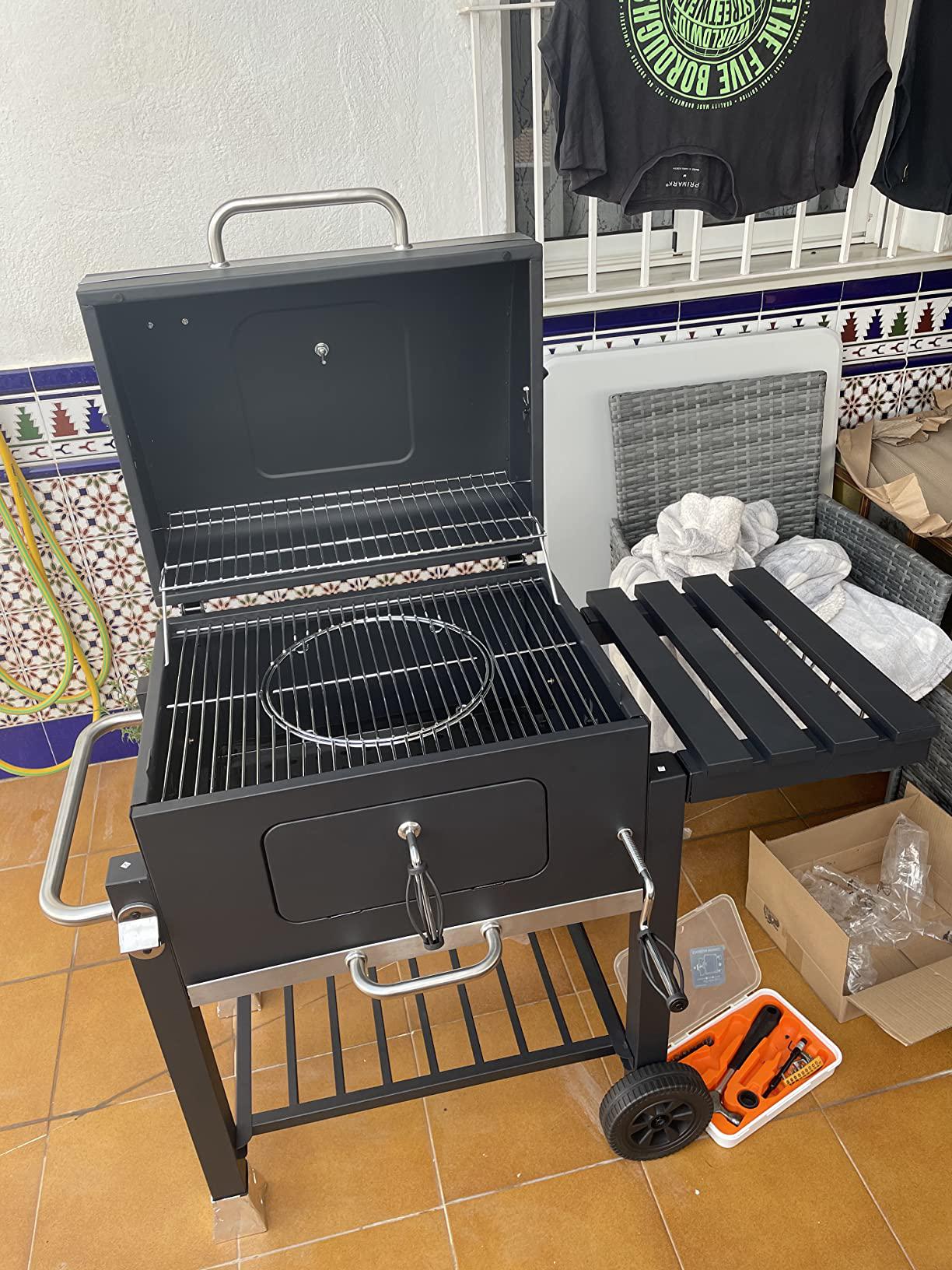 Barbecue Grill A Carbonella BBQ Da Giardino Picnic Balcone Terrazzo Con Coperchio Ruote E Termometro Ripiano Laterale Ribaltabile Con 4 Ganci Manico In Acciaio Inox 106 x 46 x 114 cm Colore Nero