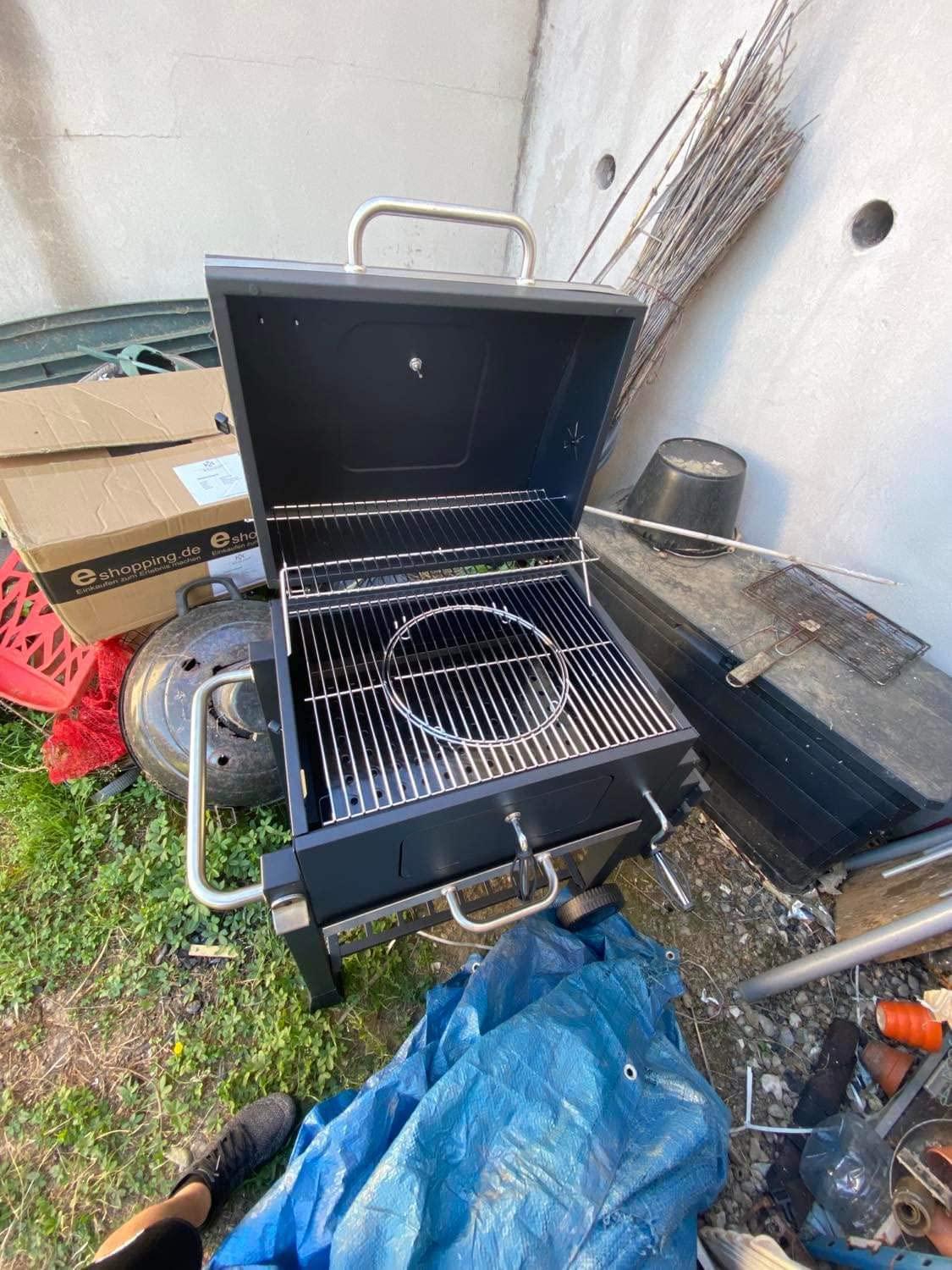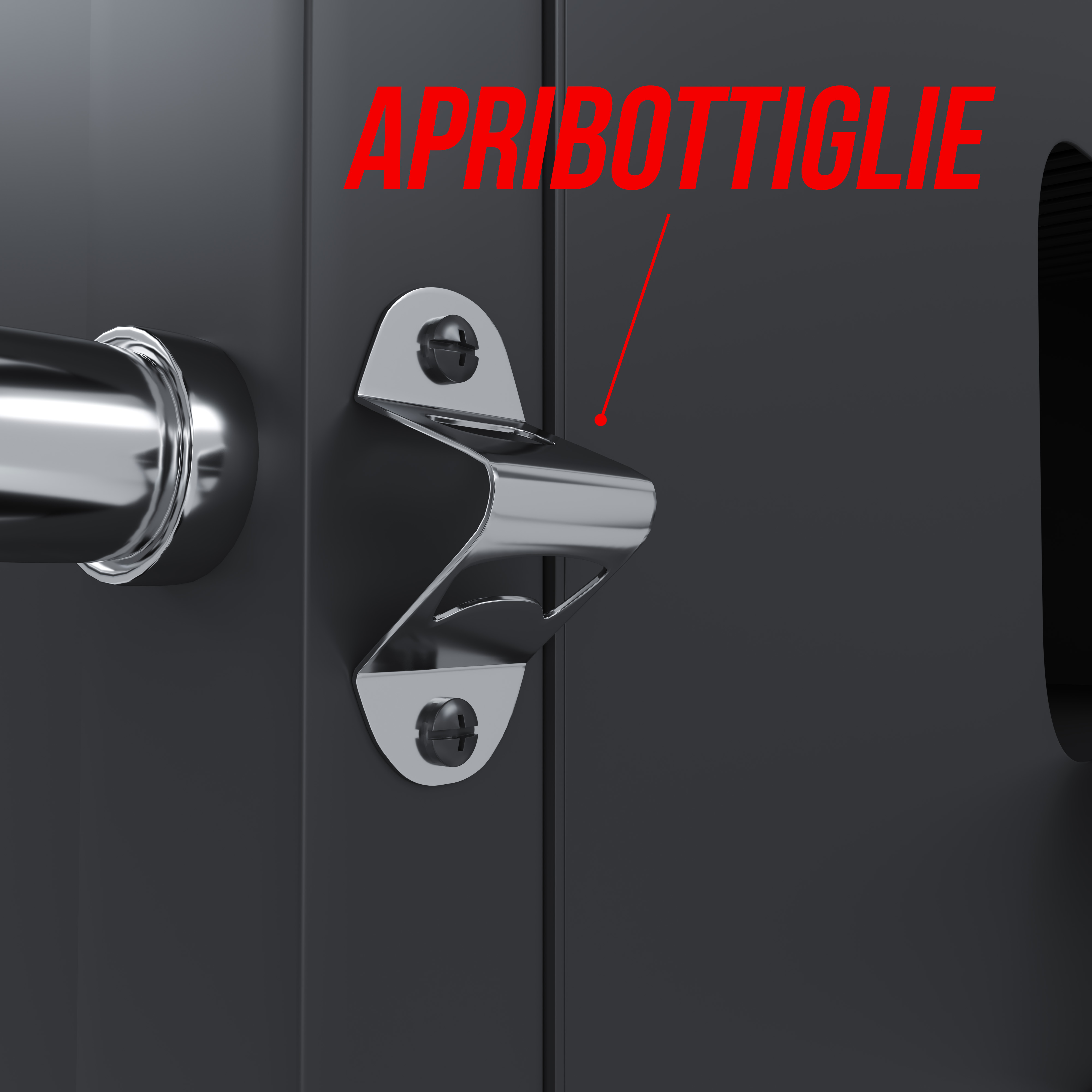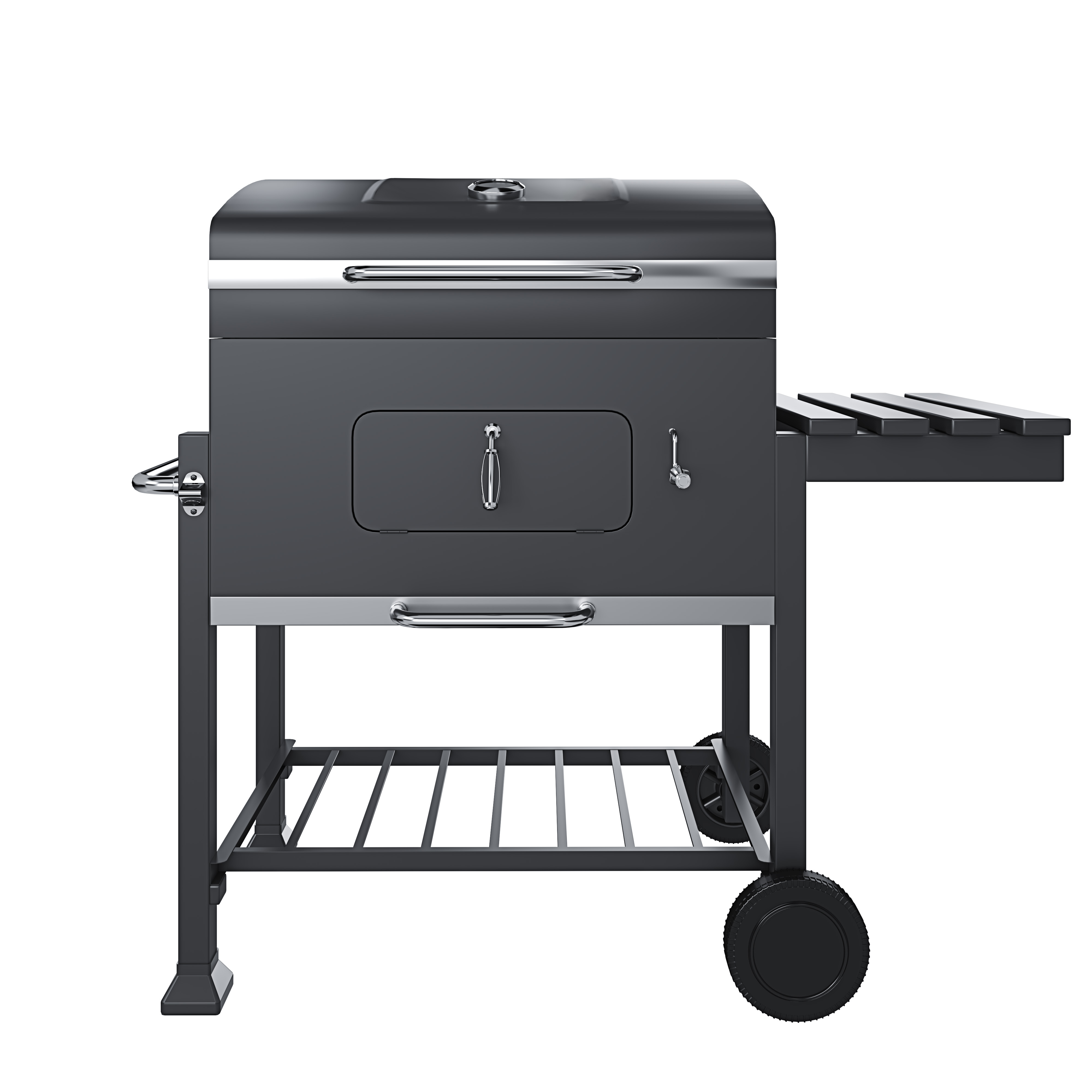 Dotato di maniglione in acciaio inox, cassetto per la cenere, ganci per le posate e piano d'appoggio